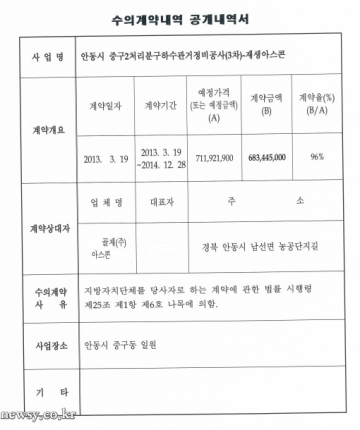 안동시는 지난 3월15일부터 19일까지 안동시 중구2처리분구하수관거정비공사 등 3건의 재생아스콘을 D골재아스콘지점과 7억8천7백여만원의 수의계약을 체결했다. 수의계약사유는 '지방자치단체를 당사자로 하는 계약에 관한 법률 시행령 제25조 제1항 제6호 나목'으로 '「농어촌정비법」에 따른 농공단지에 입주한 공장이 직접 생산하는 물품을 이들로부터 제조·구매하는 경우'이다.