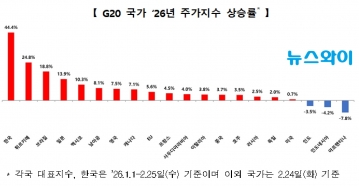 한국거래소에 따르면 올해 코스피 상승률은 44.4%로 G20 국가 중 압도적 1위다. 2위 튀르키예(24.8%), 3위 브라질(18.8%), 4위 일본(13.9%)을 큰 폭으로 앞섰다. 한국은 2025년에도 76% 상승으로 G20 1위를 기록한 바 있다.